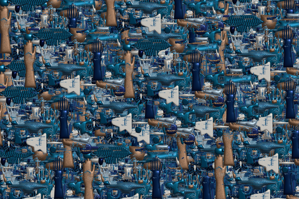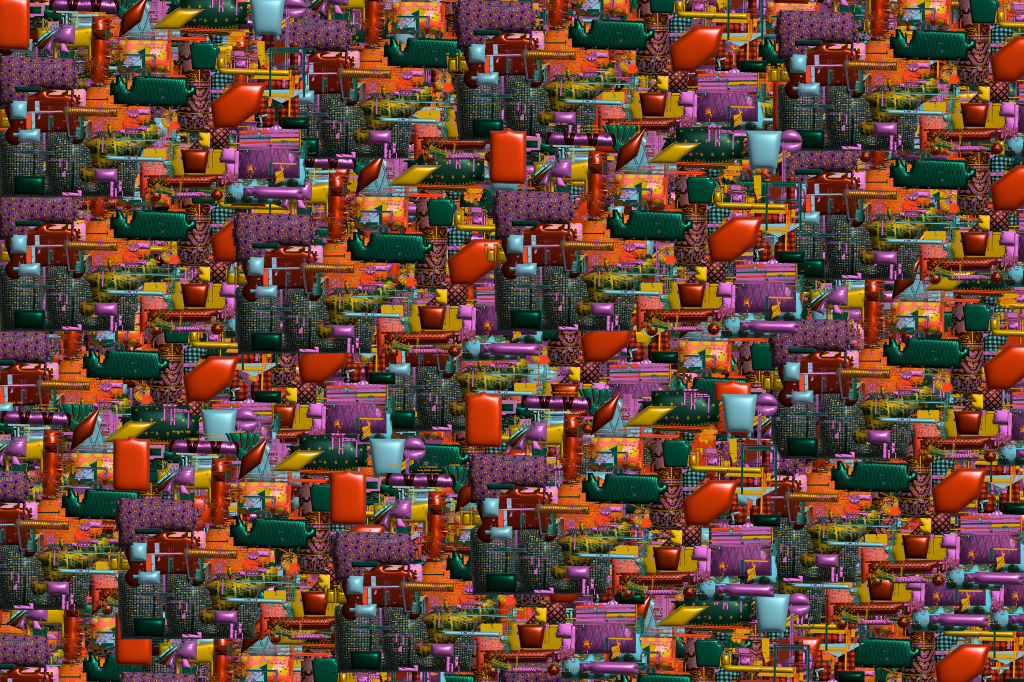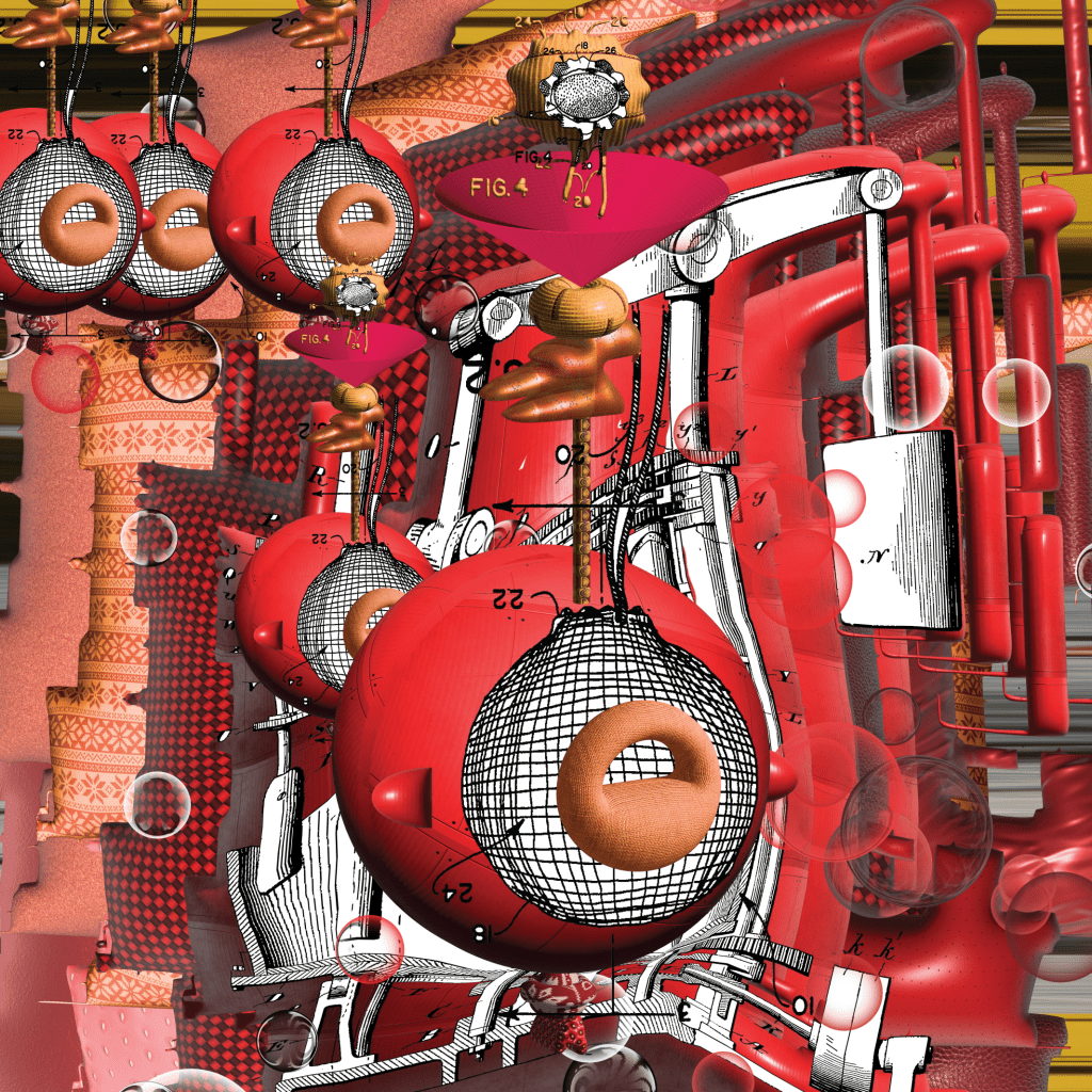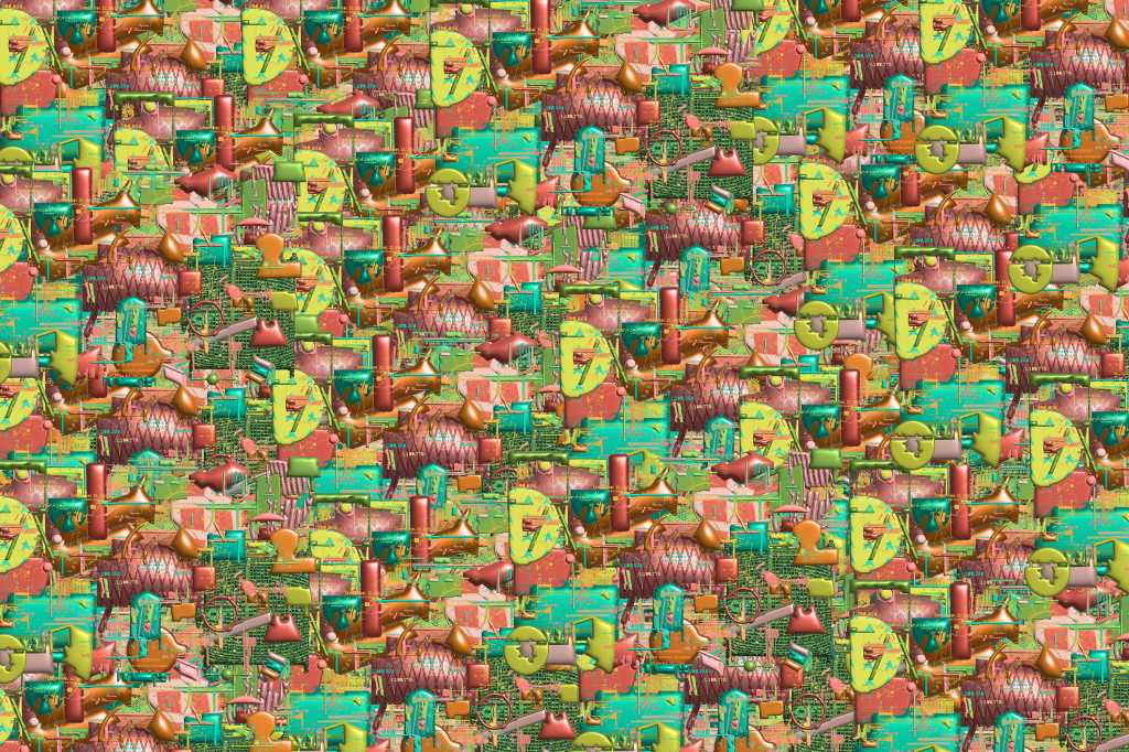 The detritus/residue and results/designs that are born from digital tinkering with imagery using various digital programs, including photoshop, illustrator, after effects, processing, AI art generators. This digital tinkering is birthed from play and insatiable curiosity and resembles that of my children and of inventors/engineers who tinker with building materials. It is like improvisation with digital imagery, akin to improvised pivoting from one task to another of caregivers. The tinkering leads to designs that create absurd linkages between ideas, through my absurd digital engineering. I also include mistakes, anomalies, idiosyncrasies, digital mistakes in an effort to reveal the role of the human in the technology space.