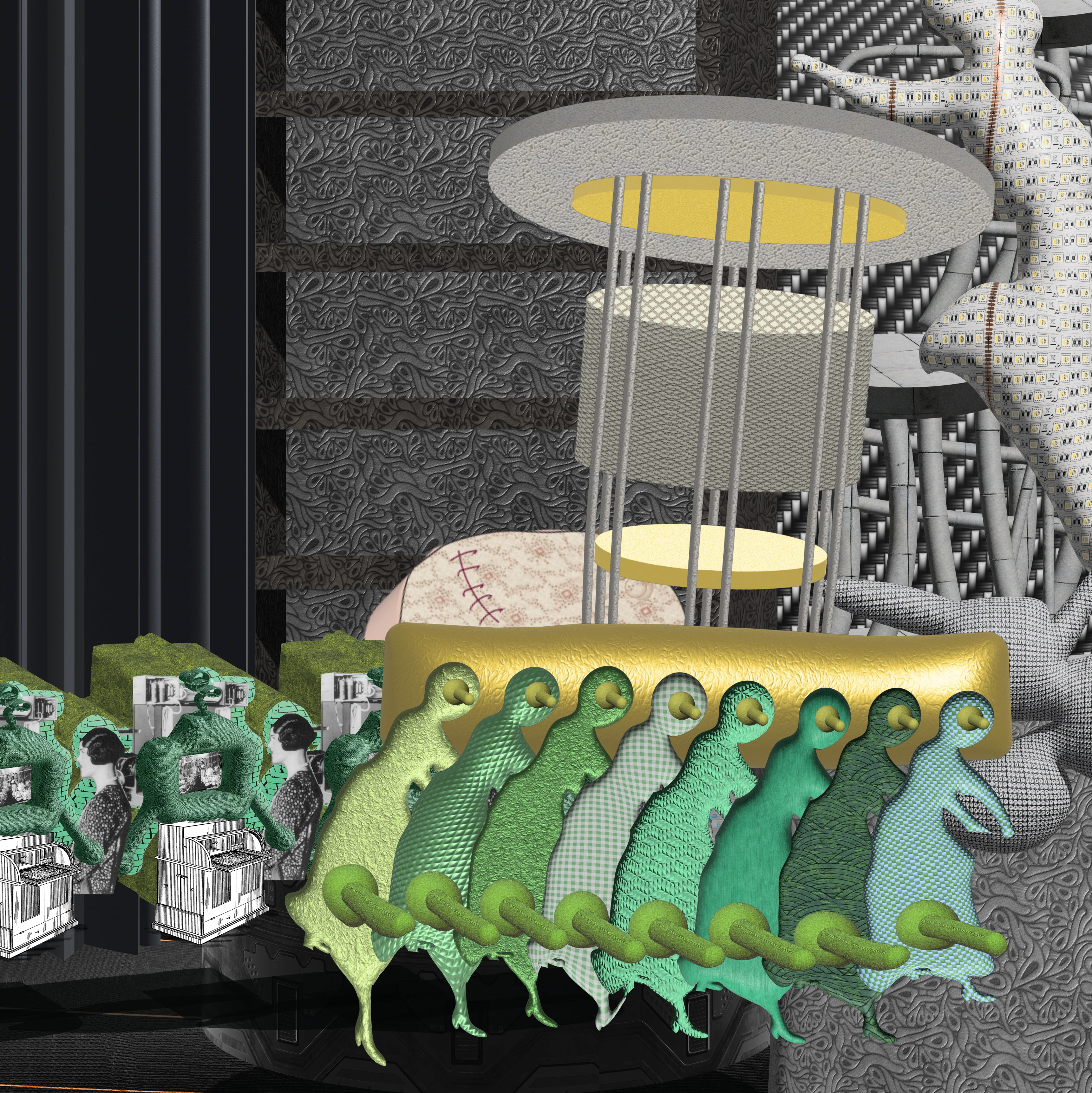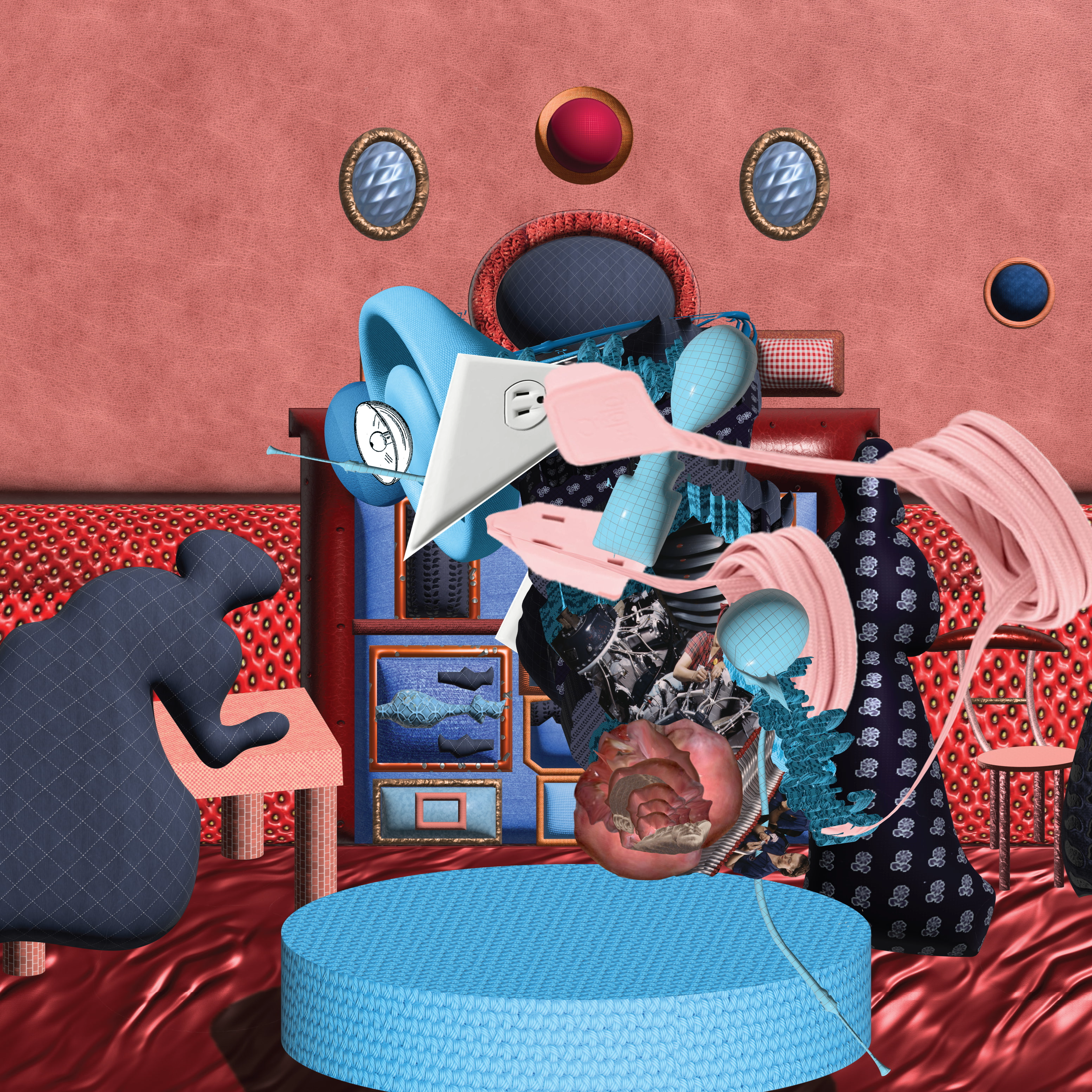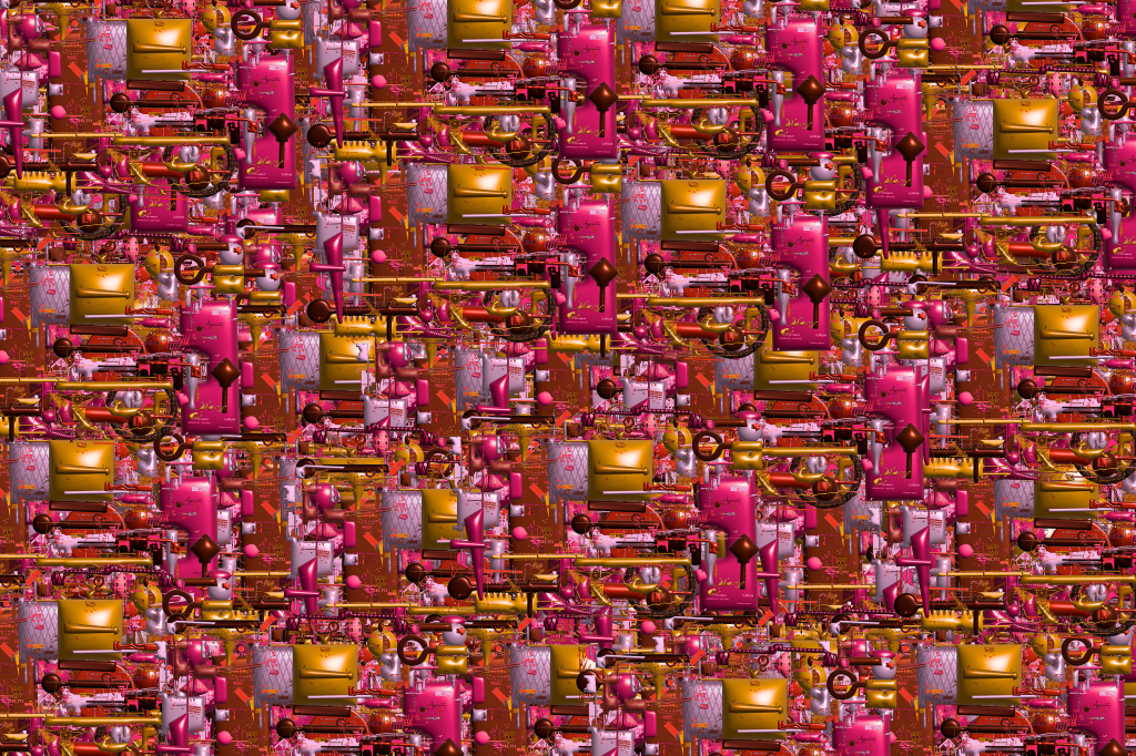 The detritus/residue and results/designs that are born from digital tinkering with imagery using various digital programs, including photoshop, illustrator, after effects, processing, AI art generators. This digital tinkering is birthed from play and insatiable curiosity and resembles that of my children and of inventors/engineers who tinker with building materials. It is like improvisation with digital imagery, akin to improvised pivoting from one task to another of caregivers. The tinkering leads to designs that create absurd linkages between ideas, through my absurd digital engineering. I also include mistakes, anomalies, idiosyncrasies, digital mistakes in an effort to reveal the role of the human in the technology space.
