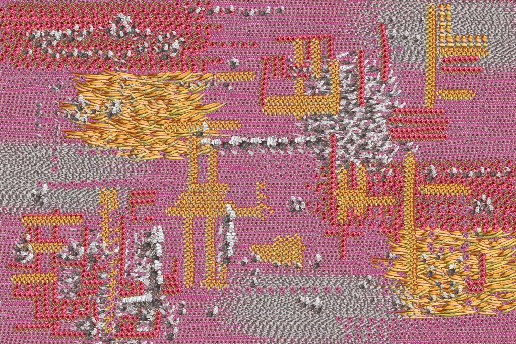 “Tapestry-engineering drawings” with annotations and details are layered over textile-like patterns. Originally-designed velvet fabrics made from disassembled and collaged elements of patents by women frame the digitally printed canvases. These tapestry-engineering drawings, connect the monumental technologies of both textiles and the computer, calling attention to the fact that textile technologies laid the foundation for contemporary computing technologies. Weaving together the two technologies in the work references work with 3D-CAD design as an engineer, digital media and sewing as an artist, and caregiving work as a mother that involves countless textiles.