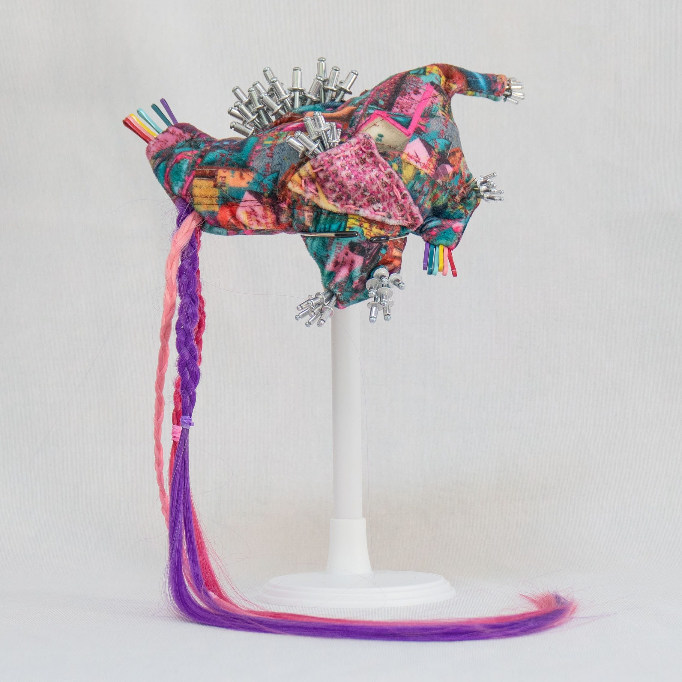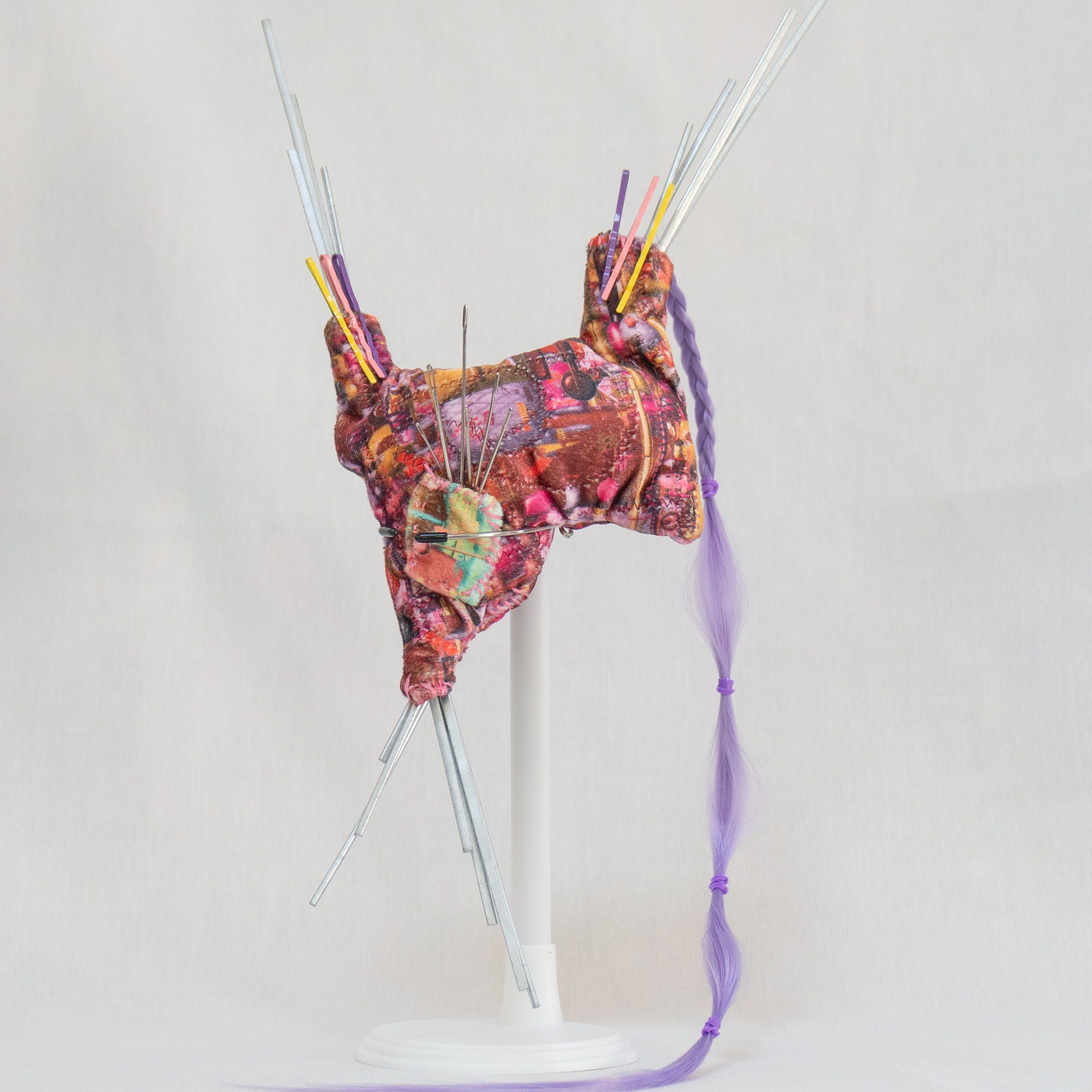 These contraptions seek to unravel new absurdly illogical myths〄 about motherhood, technology, human bodies, domestic labor, caregiving labor, aesthetic labor, emotional labor, commercial/marketing labor. These myths place value in creativity and improvisation in an absurdist resistance against and proposal for reimagining an alternative to patriarchal, capitalist, production-based, essentialist, seemingly rational, seemingly useful, seemingly logical, optimization-driven, commercialized, deterministic systems. Many of the items and images employed in the enmeshing point to gender and racial biases that absurdity seeks to flip or turn on its head.