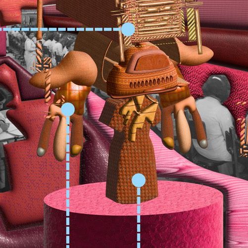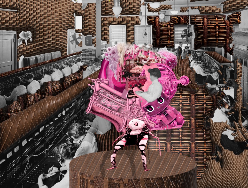 The work weaves an entangled mesh of ideas that impact one another like a rube Goldberg machine, each a thread originating from a lived experience in which i encountered the work of women and underrepresented groups ⌱in daily life. The threads are woven into a digital contraption/being in ways based on what I call digital tinkering ⍾to make creative connections between seemingly unrelated imagery but which indeed are entangled in complicated ways (ways that i design like an engineer of absurdity) just like they are in my life.