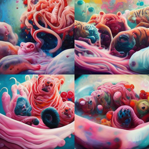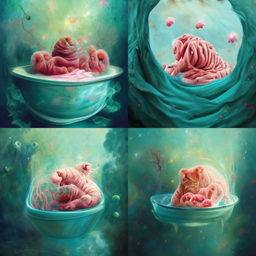 Today, I entered the prompt that was generated by my !!! techn010ffspring !!! absurd creative idea generator into the Midjourney AI Art Generator: “aches tardigrade nurse smell spin spaceship saber tooth tiger under a tree bathtub spin maria beasley dirt jello messy uterus identical twins saliva cattywampus”