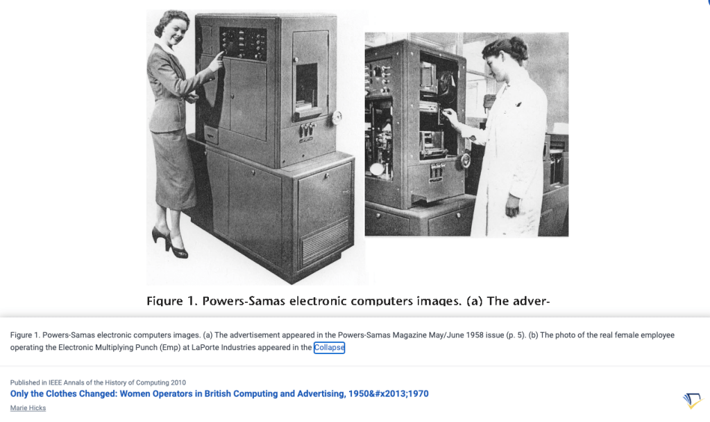 [B17] Mary Hicks’ book entitled “Programmed Inequality: How Britain Discarded Women Technologists and Lost Its Edge in Computing” ● MIT Press ● 2018 ● Historical Images of women operating the “Powers-Samas electronic computers images found in an advertisement that appeared in the Powers-Samas Magazine May/June 1958 issue (p. 5) and the photo of the real female employee operating the Electronic Multiplying Punch (Emp) at LaPorte Industries.”