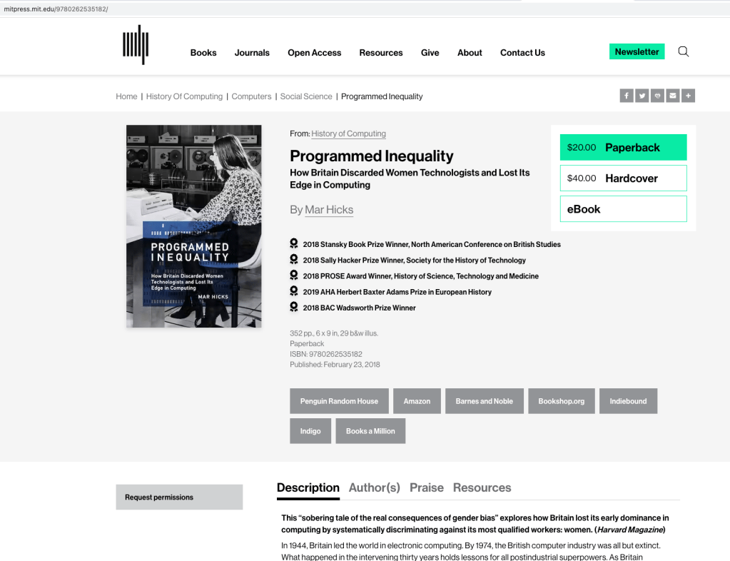 Book by Mar Hicks entitled “Programmed Inequality: How Britain Discarded Women Technologists and Lost Its Edge in Computing” ● MIT Press ● 2018