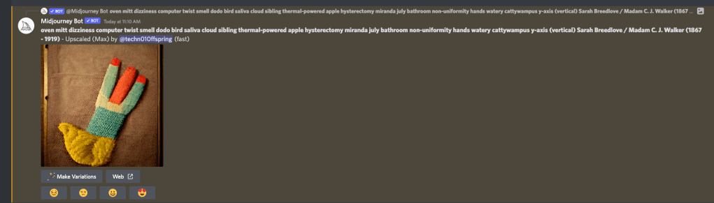 The prompt entered was: “oven mitt dizziness computer twist smell dodo bird saliva cloud sibling thermal-powered apple hysterectomy miranda july bathroom non-uniformity hands watery cattywampus y-axis (vertical) Sarah Breedlove / Madam C. J. Walker (1867 – 1919)”