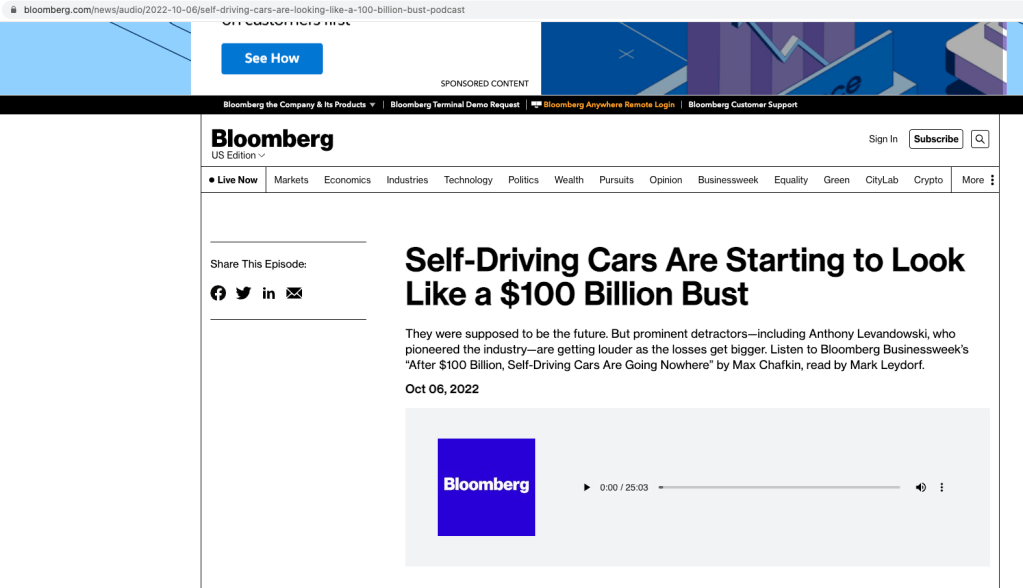 Prompt: “Self-Driving Cars Are Starting to Look Like a $100 Billion Bust