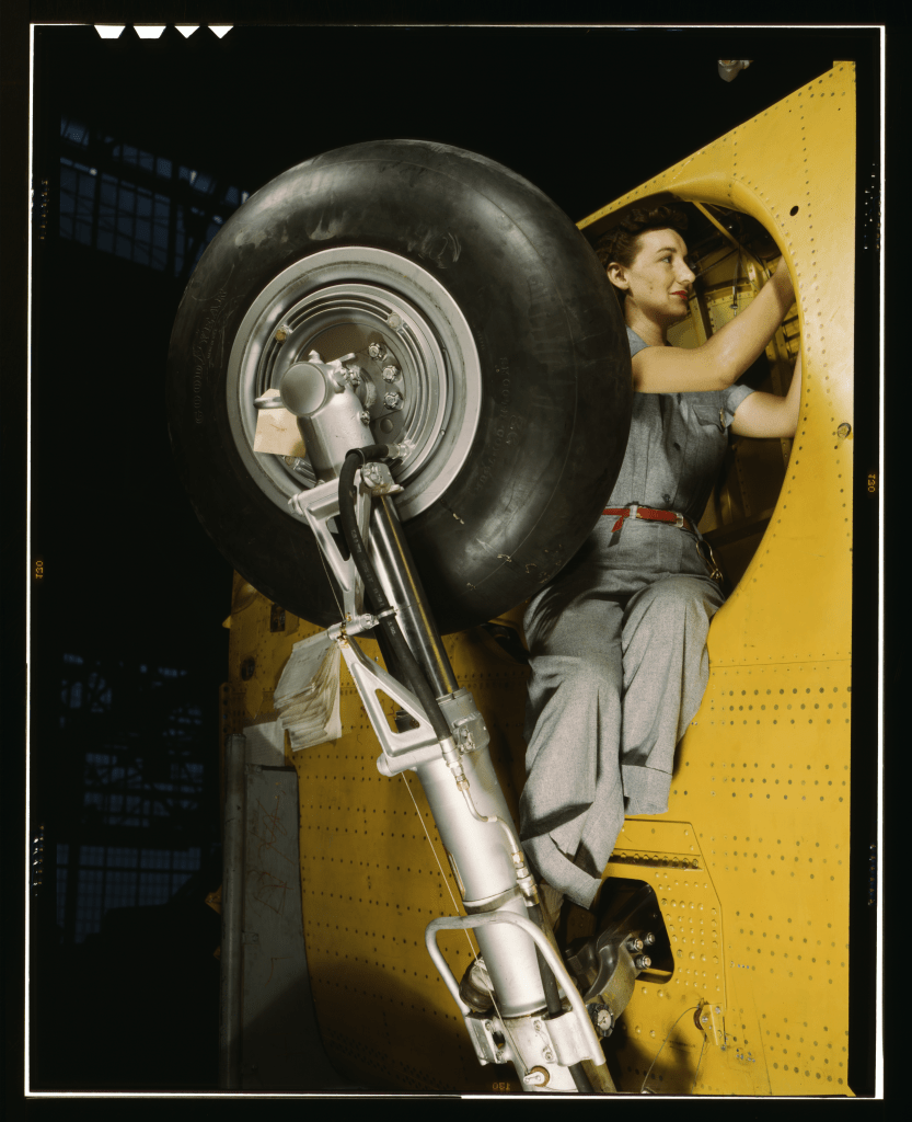 [B1] “This woman worker at the Vultee-Nashville is shown making final adjustments in the wheel well of an inner wing before the installation of the landing gear, Nashville, Tenn. This [is] one of the numerous assembly operations in connection with the mass production of Vultee “Vengeance” dive bombers.” ● Library of Congress ● 1943 ● Photo by Alfred Palmer.