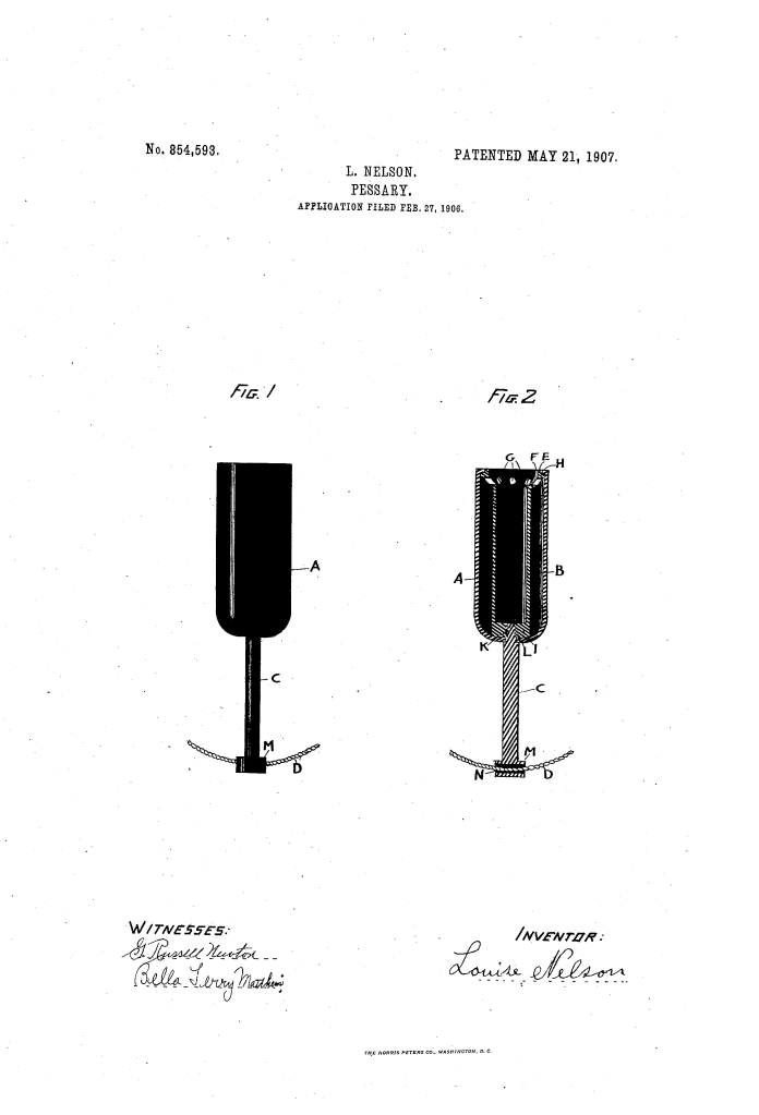[H1] Louis Nelson ● US Patent #854,593 ● Patented May 21, 1907 ● Pessary ● “My invention relates to an improvement in pessary, the object being to furnish a sanitary contrivance to be used by ladies during menstruation and also a more comfortable support for the womb than heretofore.”