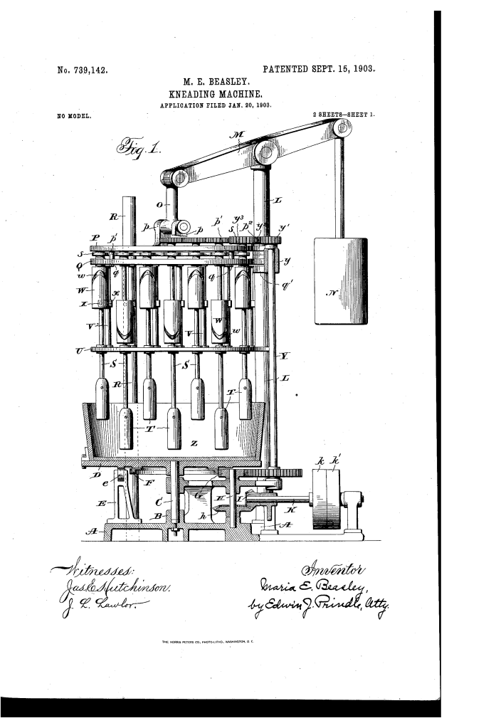 [A9] Maria E. Beasley ● US Patent #739142 ● Patented September 15, 1903 ● Kneading Machine ● “The object of my invention has been to provide a kneading-machine which shall be so thorough and uniform in its action that the maximum amount of dough shall be produced from any given amount of flour” ● “This operation is rendered easy by the action of the counterweight N. The lever M is then rocked in the opposite direction, bringing the plungers down into the pan. The cams W are preferably so arranged that each alternate plunger is down while its neighbors are up. The driving-shaft is then set in motion, and the pan is revolved by means of the gearing driving the table D. At the same time the plungers are revolved by means of the belt and toothed gearing at their upper ends, and they are caused to rise and fall by the action of the cams WV on the pins X. Owing to the revolution of the pan, every portion of the dough is brought under the operation of the plungers, and a most thorough mixing of the flour, water, yeast, and other constituents of the dough results. At the same time the twisting or turning of the plungers causes the dough to be stretched or drawn apart between each two plungers, and this action is further increased by the fact that adjacent plungers are always moving in opposite directions.